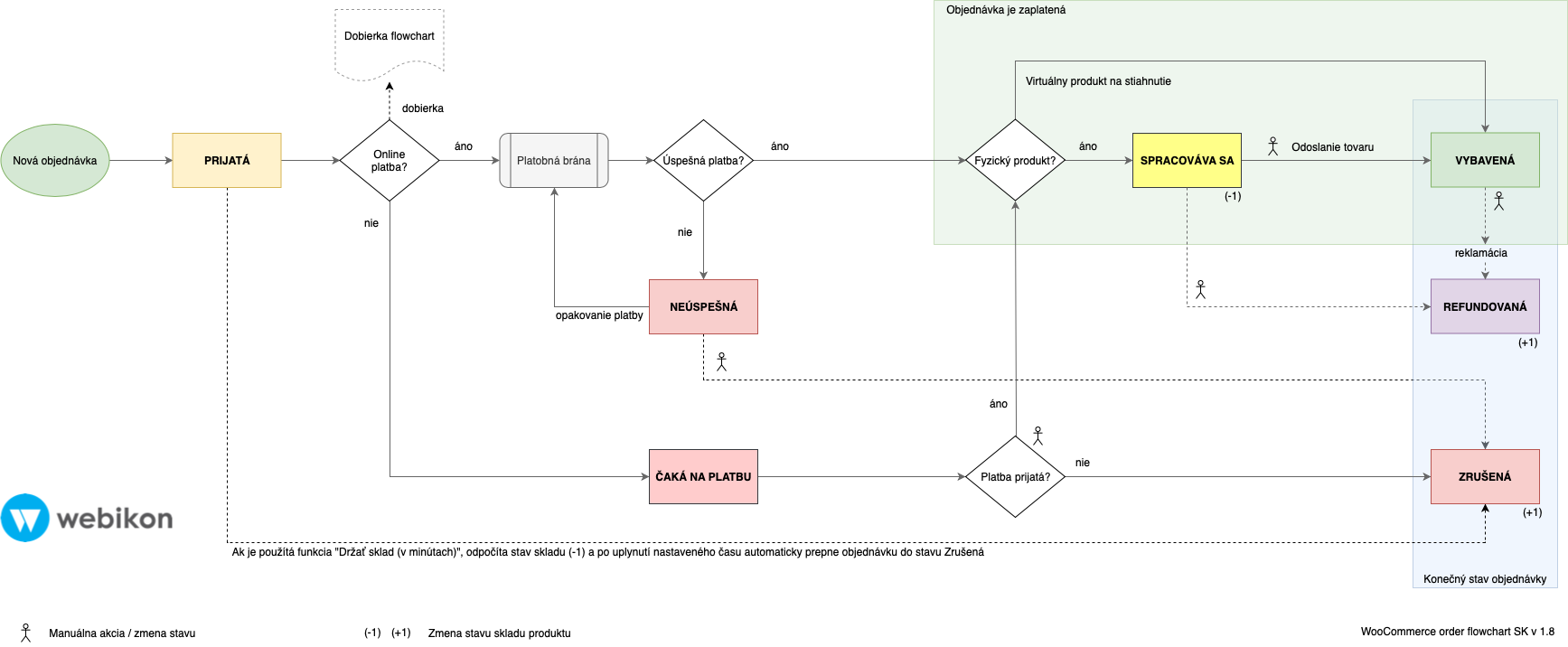 Každá objednávka má okrem svojho ID aj stav, v ktorom sa aktuálne nachádza. Začiatočný stav je vždy stav Prijatá (angl. Pending). Tu je prehľad všetkých stavov objednávok vo WooCommerce.
