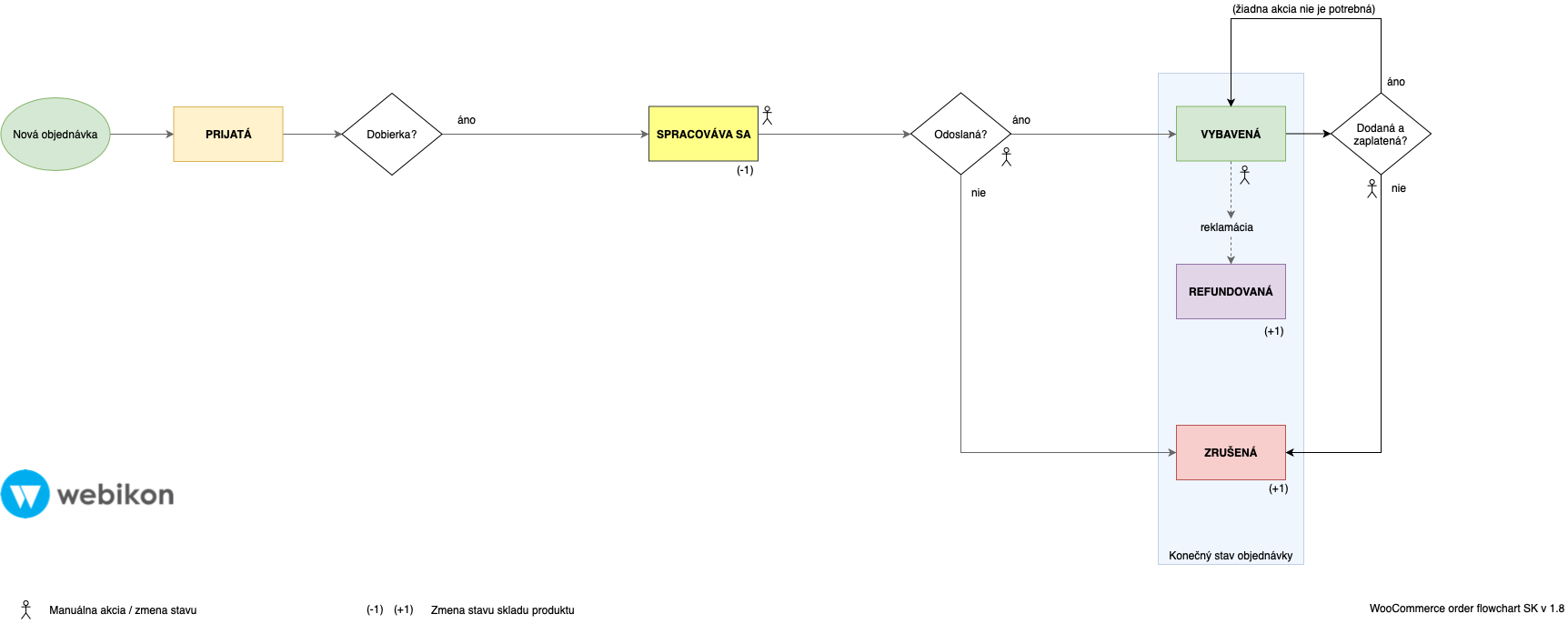 Každá objednávka má okrem svojho ID aj stav, v ktorom sa aktuálne nachádza. Začiatočný stav je vždy stav Prijatá (angl. Pending). Tu je prehľad všetkých stavov objednávok vo WooCommerce.